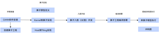 算子入图的开发流程如下图所示,算子工程创建完成后,基于工程代码框架完成算子原型定义、Kernel侧算子实现、Host侧Tiling实现并完成算子入图开发,通过工程编译脚本完成算子的编译部署,之后即可基于图IR执行算子,比如单算子模型执行或者IR构图的方式调用自定义算子。该开发流程以工程化算子开发为基础,除了需要提供算子实现中的算子实现文件外,还需要额外交付算子入图的代码文件。