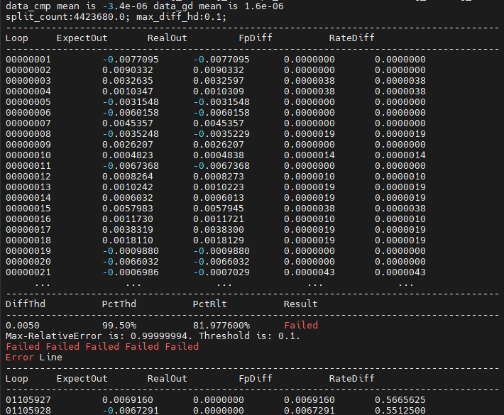 CPU/Simulator调测生成的精度比对结果文件出现“Failed”,部分输出为0,结果如图5所示。