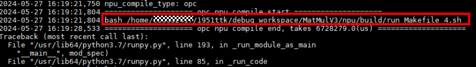 - 手动拷贝gen_tiling_data_cmd后的所有命令,在终端窗口执行,通过打屏或者落盘的日志文件进一步分析问题。