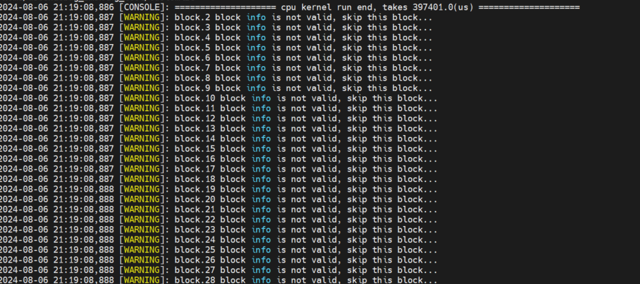 开启printf/PRINTF/DumpTensor/DumpAccChkPoint/assert打印功能后,代码执行出现block info is not valid, skip this block,无打印信息。