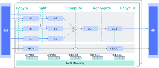 大多数情况下,Local Memory的存储,无法完整的容纳算子的输入与输出,需要每次搬运一部分输入进行计算然后搬出,再搬运下一部分输入进行计算,直到得到完整的最终结果,也就是需要做核内的输入切分。切分的策略如下所示: