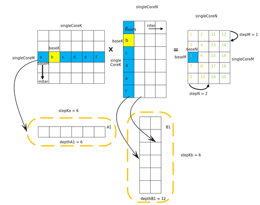 depthA1,depthB1:A1、B1上存储的矩阵片全载A2/B2的份数,A2、B2存储大小分别是baseM * baseK,baseN * baseK。