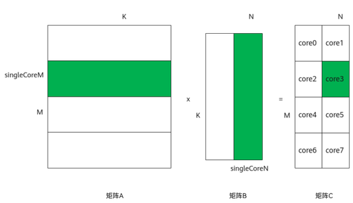 比如,下图中共有8个核参与计算,将A矩阵沿着M轴划分为4块,将B矩阵沿着N轴切分为两块,单核上仅处理某一分块(比如图中绿色部分为core3上参与计算的数据):SingleCoreM * K大小的A矩阵分块和SingleCoreN* K大小的B矩阵分块相乘得到SingleCoreM * SingleCoreN大小的C矩阵分块。