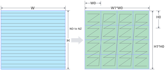 如下图所示 (W,H)大小的矩阵被分为(H1*W1)个分形,按照column major排布,形状如N字形;每个分形内部有(H0*W0)个元素,按照row major排布,形状如z字形。所以这种数据格式称为NZ(大N小Z)格式。