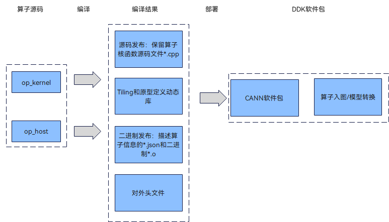 - 二进制发布: 对算子kernel侧实现进行编译,生成描述算子相关信息的json文件*.json和算子二进制文件*.o。算子调用时,如果需要直接调用算子二进制,则使用该编译方式,当前暂不支持该方式进行部署。