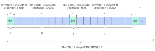 在核函数所有输出的最后增加一个GM_ADDR类型的输出参数,并在核函数计算完成后,将输出shape信息写入到该出参中。shape信息的排布格式如下,大小为n * (8 + 1),每个元素的数据类型为uint64_t。其中n表示待刷新shape信息的输出个数,每个输出的shape信息都通过第1个元素来保存实际的shape维度(dim),后续的8个元素来保存具体每个维度的shape信息。