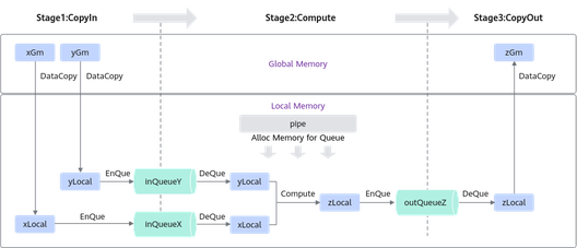 - CopyIn,Compute任务间通过VECIN队列inQueueX,inQueueY进行通信和同步,Compute,CopyOut任务间通过VECOUT队列outQueueZ进行通信和同步。