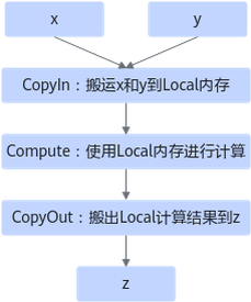 - Add算子的实现流程分为3个基本任务:CopyIn,Compute,CopyOut。CopyIn任务负责将Global Memory上的输入Tensor xGm和yGm搬运至Local Memory,分别存储在xLocal,yLocal,Compute任务负责对xLocal,yLocal执行加法操作,计算结果存储在zLocal中,CopyOut任务负责将输出数据从zLocal搬运至Global Memory上的输出Tensor zGm中。