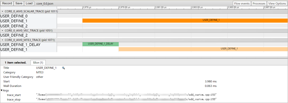 如下图所示,其中USER_DEFINE_1_DELAY表示DataCopy指令下发到指令开始执行的时间,USER_DEFINE_1表示指令执行的时间。