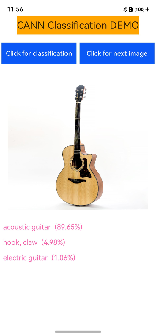 本节阐述同步模式下单模型的使用,从流程上分别阐述每个步骤在应用层和native层的实现和调用。接口请参见API参考,示例请参见SampleCode,本示例支持加载离线模型对图片中的物体进行分类,App运行效果图如下所示。