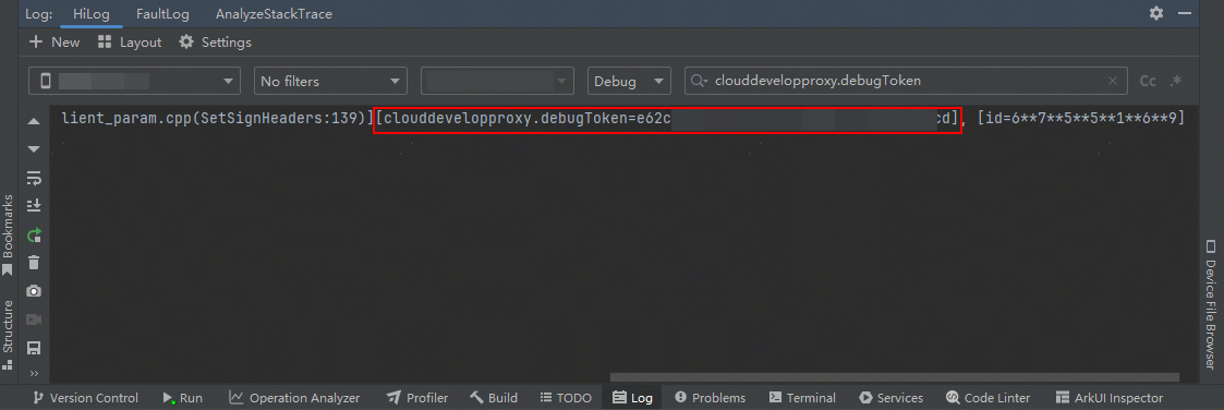 通过设置“No filters”模式、过滤“clouddevelopproxy.debugToken”关键字,查找日志中打印的调试凭据,并复制该调试凭据。