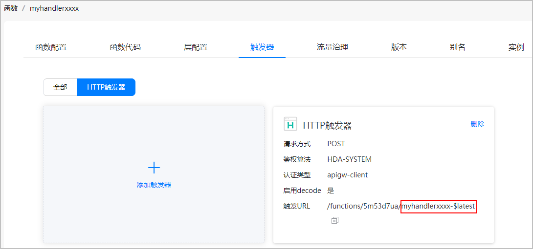 在函数的触发器页面点击“HTTP触发器”,查看“触发URL”的后缀,获取触发器的标识,格式为“函数名-版本号”。如下图所示,“myhandlerxxxx-$latest”即为HTTP触发器标识,其中“myhandlerxxxx”为函数名,“$latest”为版本号。