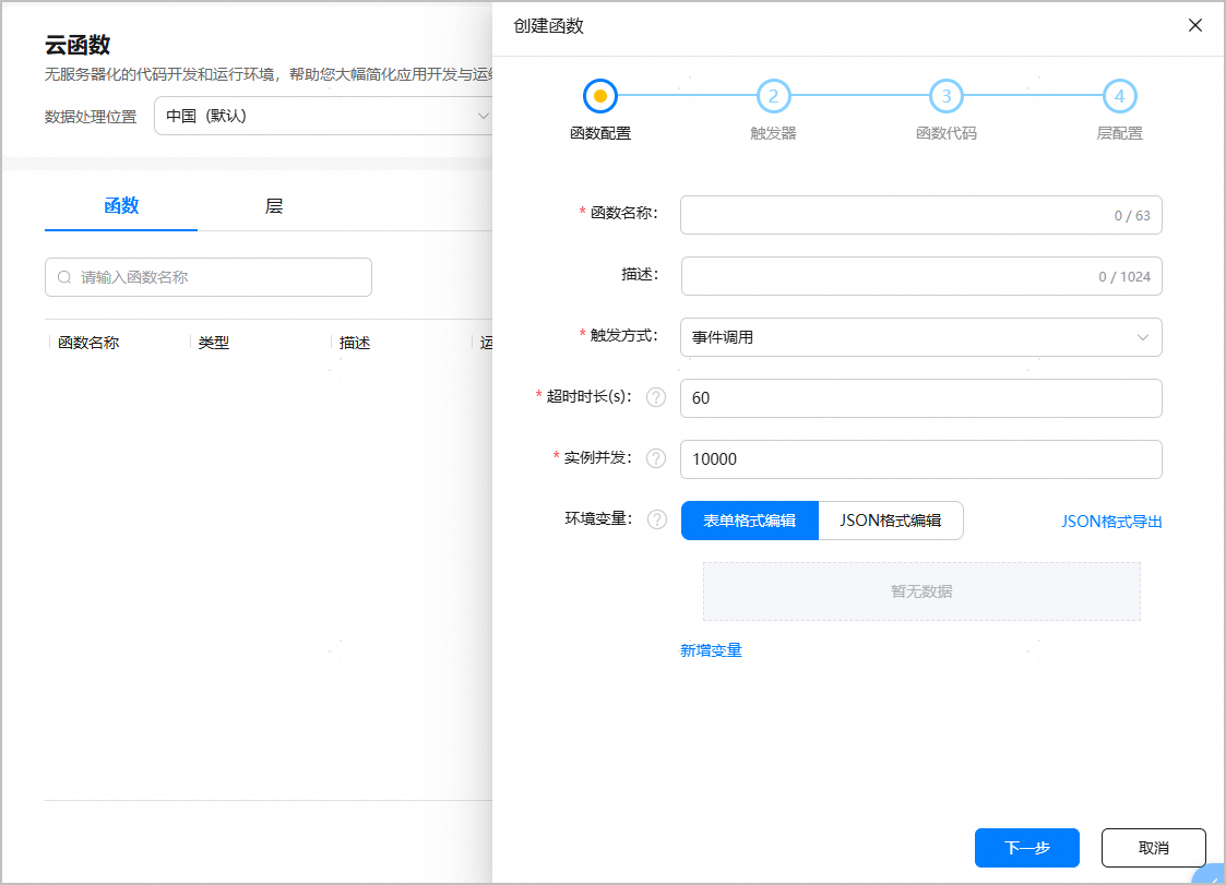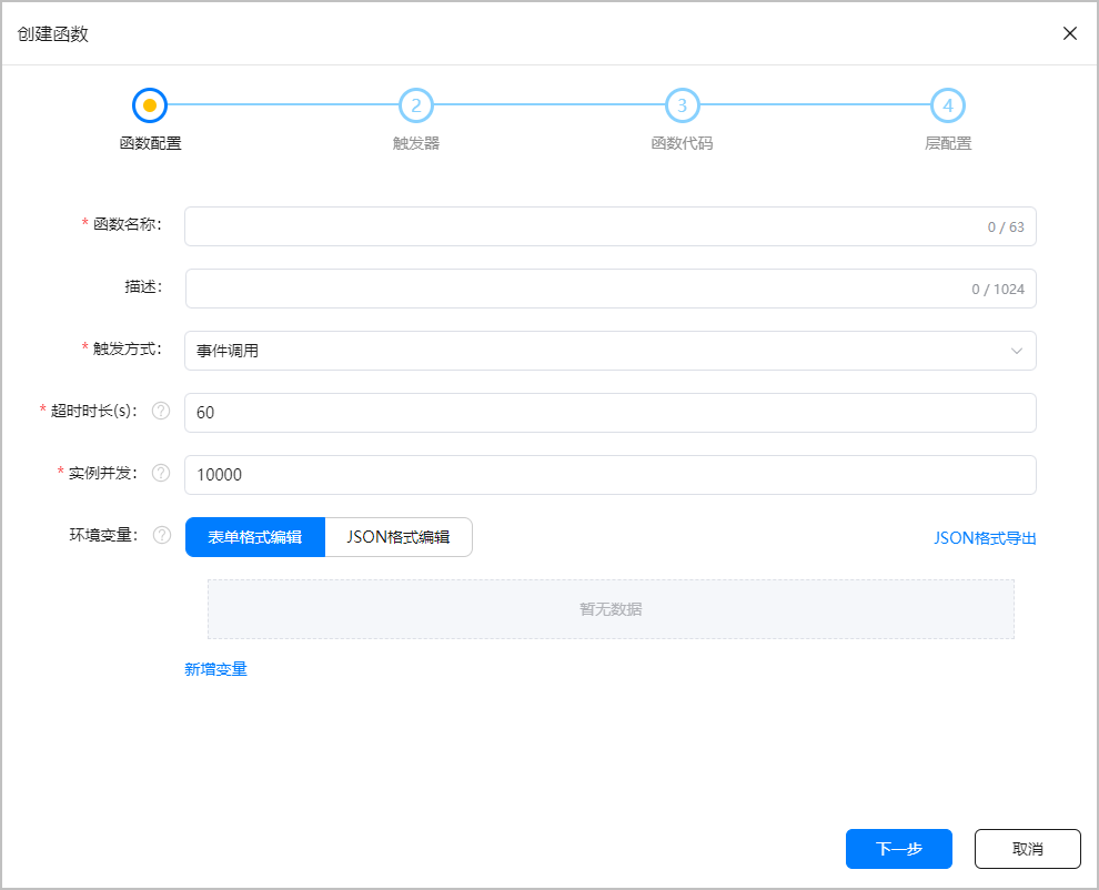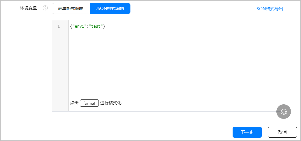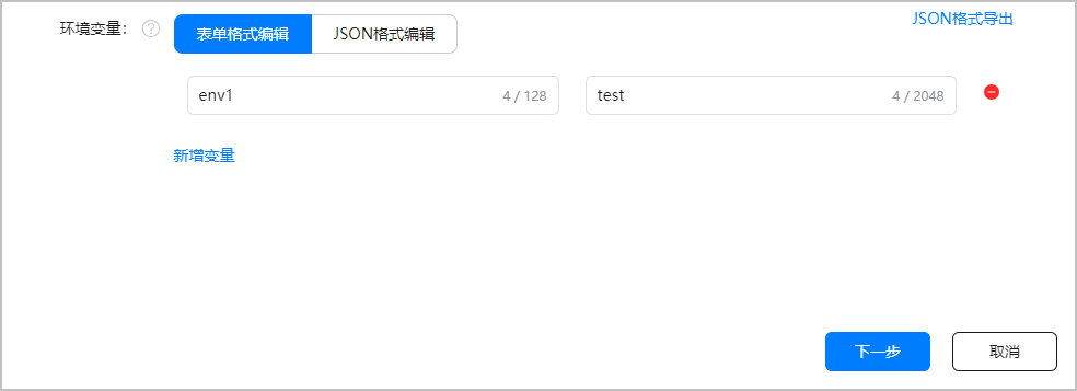 (可选)可根据需要添加环境变量,支持表单格式和JSON格式两种编辑方式。添加完成后,还可以点击“JSON格式导出”,导出以“函数名称.json”格式命名的环境变量文件,以备后续使用。