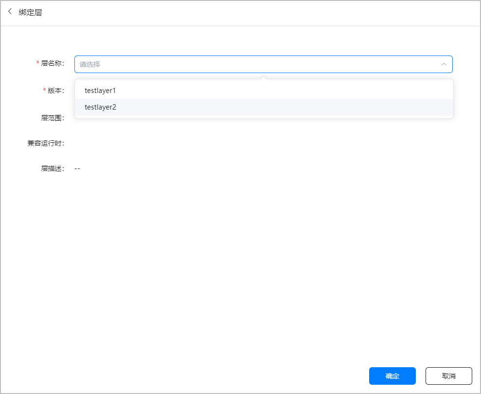 在右侧弹出的“绑定层”界面中,下拉框选择“层名称”和“版本”,“层范围”等信息根据层的配置将被自动填充,完成层绑定后点击“确定”。一个函数最多可以绑定5个层。