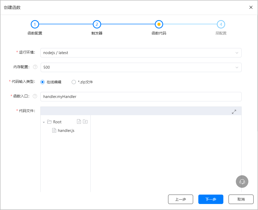 进入“函数代码”页面,配置“运行环境”、“内存配置”、“代码输入类型”等信息,配置完成后点击“下一步”。