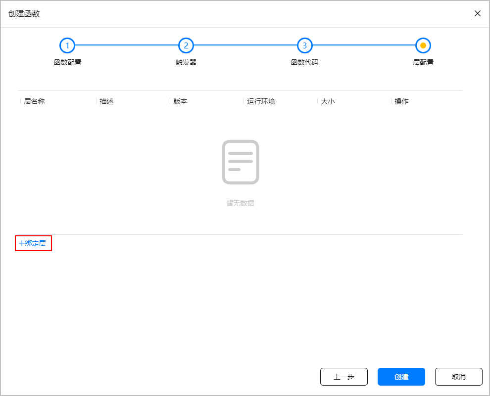 如果尚未创建层,可跳过下述步骤,直接点击页面底部的“创建”完成函数定义,后续创建层之后可在函数详情页再进行层配置,为函数绑定层。如果在创建函数之前已创建层,可按照下述步骤进行操作。