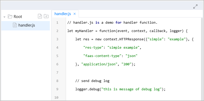 | 编辑器 | 编辑器具有如下能力: - 语法高亮:按照node.js语法高亮显示代码。 - 语法校验:语法有错误时会给出错误提示。 - 代码提示:输出代码自动给出相关代码提示。 - 代码填充:选择后系统代码可自动填充。 - 格式化:快捷键Ctrl+Shift+B。 - 支持快捷键操作:Ctrl+v, Ctrl+c, Ctrl+z, Ctrl+x, Ctrl+f, Ctrl+/等。 |