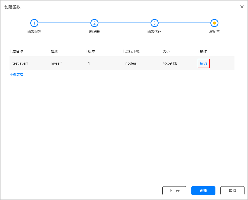 返回到“层配置”界面,绑定成功的层将展示在层列表中。如果需要解除层与函数的绑定关系,点击“解绑”即可。