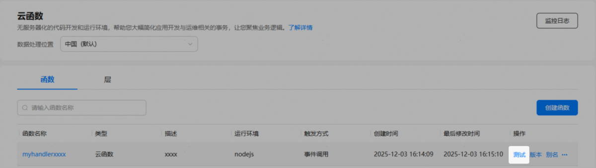 方式一:函数列表中点击函数名称右侧“操作”列的“测试”,在右侧弹出的“测试函数”界面进行测试。