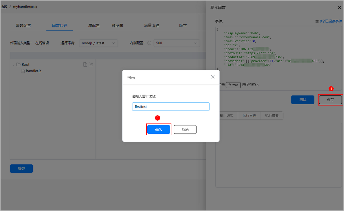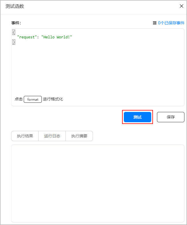 使用默认测试事件:直接点击“测试”对函数进行测试。