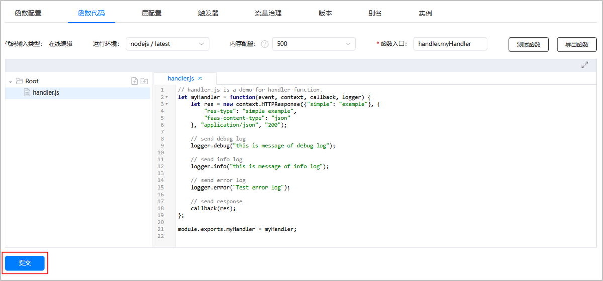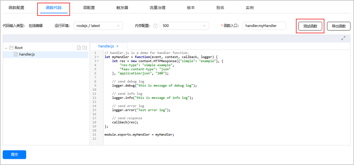 “代码输入类型”为“在线编辑”的函数,测试过程中,如果需要修改函数入口文件代码,可直接在“函数代码”页签的代码编辑器中修改,然后点击页面底部的“提交”。当界面提示更新函数成功时,则可以点击“测试函数”对更改后的代码进行测试。