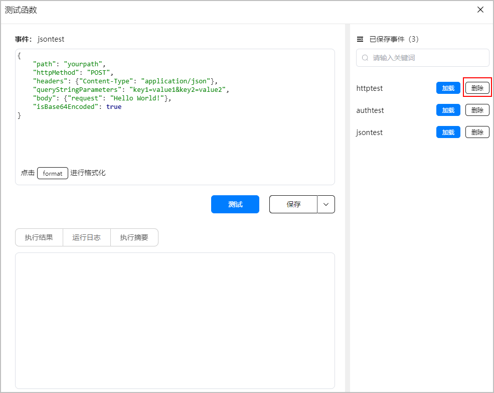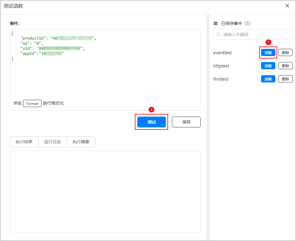 展开已保存的测试事件列表,选择已配置的事件名称右侧的“加载”,然后点击“测试”,函数处理事件并返回测试结果。