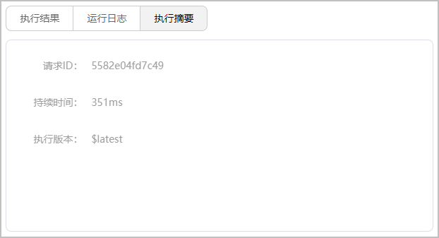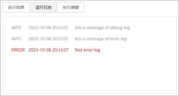运行日志:展示函数运行过程中,通过logger API打印的日志,支持输出debug级别及以上日志(以下仅为日志输出示例)。