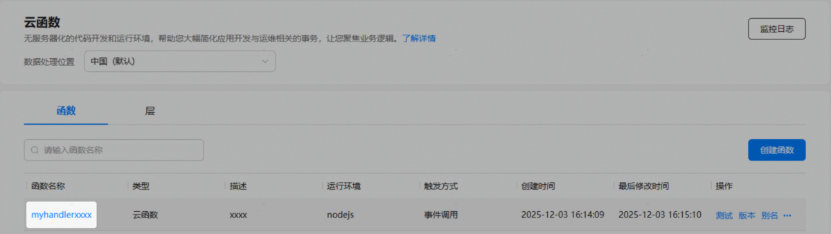 在函数列表中点击已创建的函数名称,进入函数详情页面。