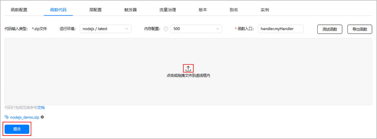 重新上传函数部署包,然后点击页面底部的“提交”。当界面提示更新函数成功时,则可以点击“测试函数”对更改后的代码进行测试。