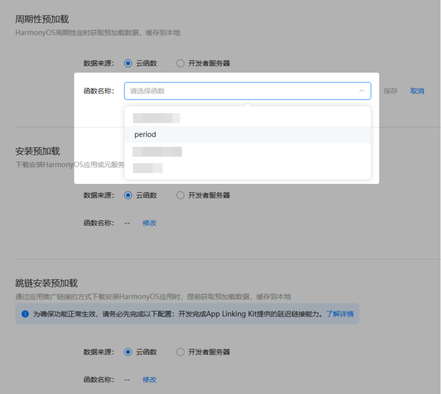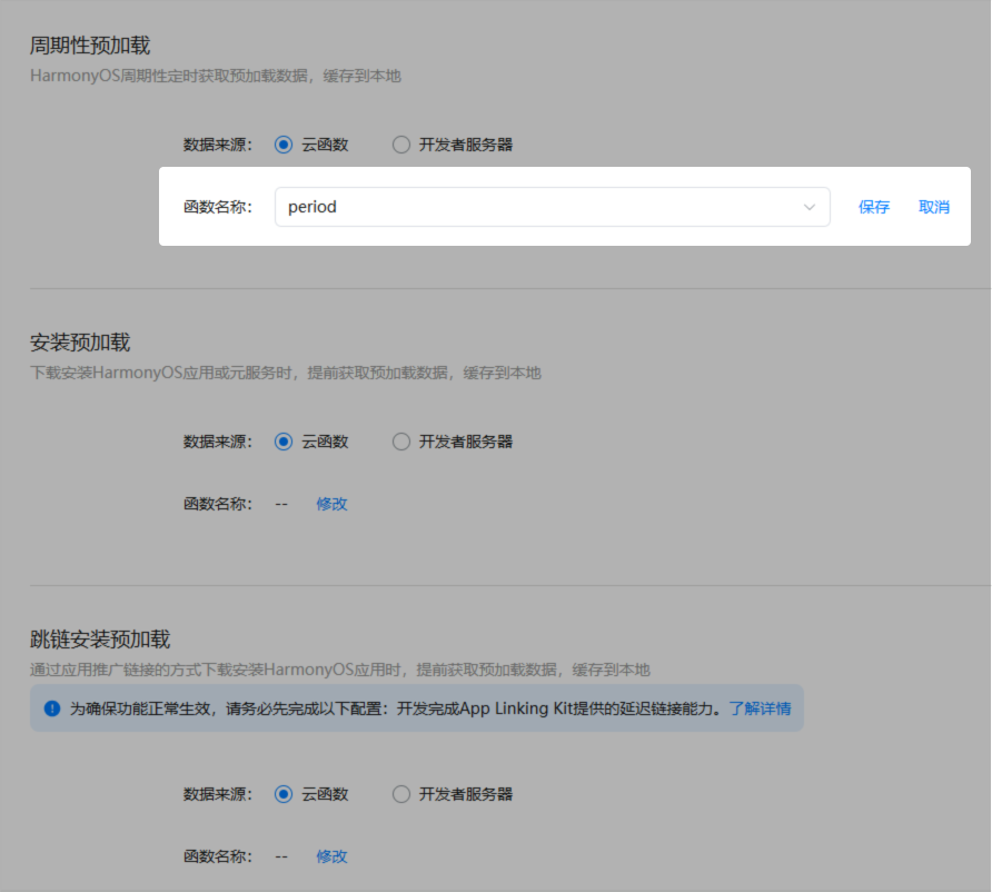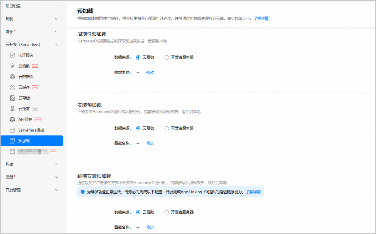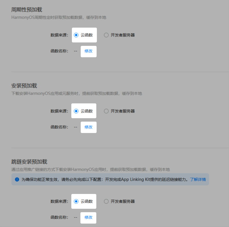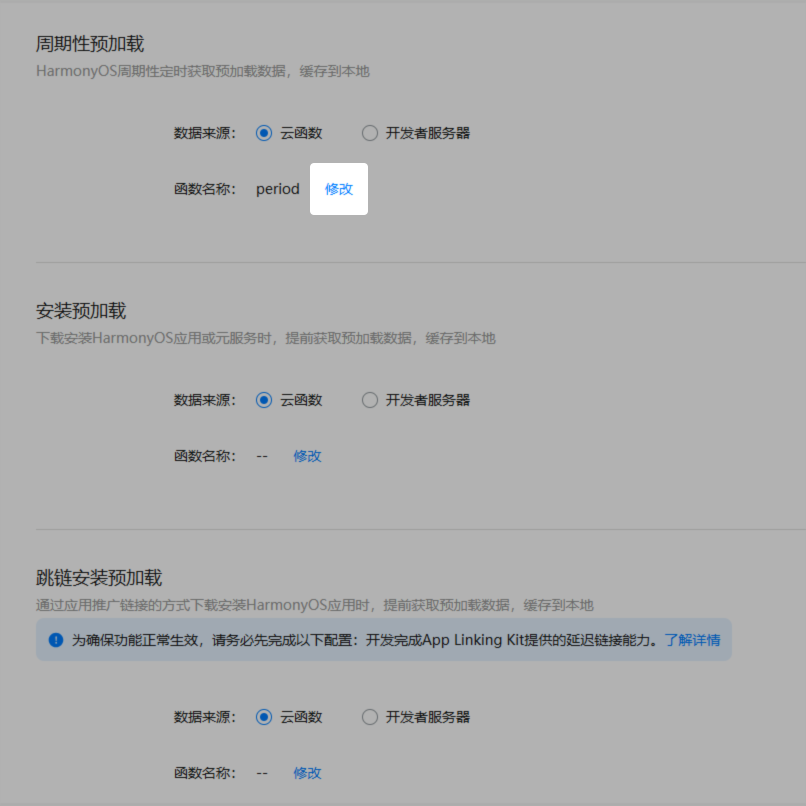 根据实际需要,在“周期性预加载”、“安装预加载”或者“跳链安装预加载”区域,“数据来源”选择“云函数”,然后点击“函数名称”后的“修改”。