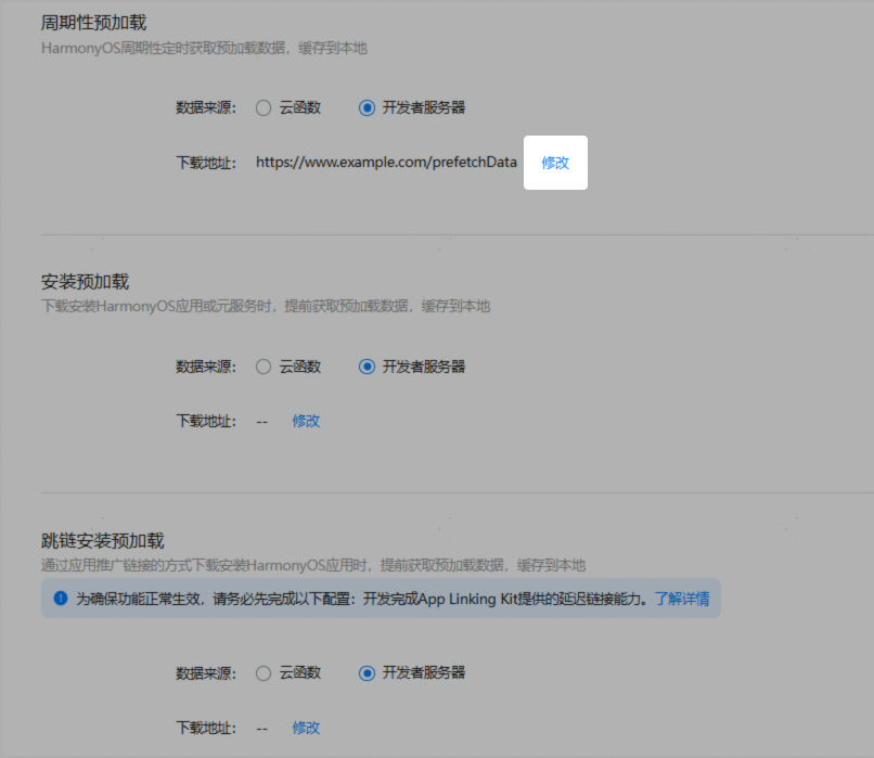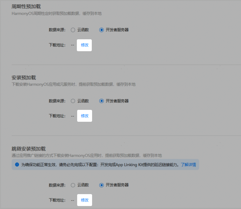 - 由于跳链安装预加载功能需要使用App Linking Kit提供的延迟链接能力,因此在配置跳链安装预加载之前,请务必先完成延迟链接的开发。具体请参见通过延迟链接跳转至应用详情页。