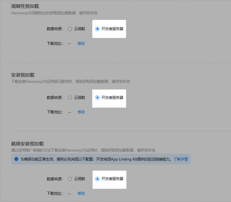 根据实际需要,在“周期性预加载”、“安装预加载”或者“跳链安装预加载”区域,“数据来源”选择“开发者服务器”。