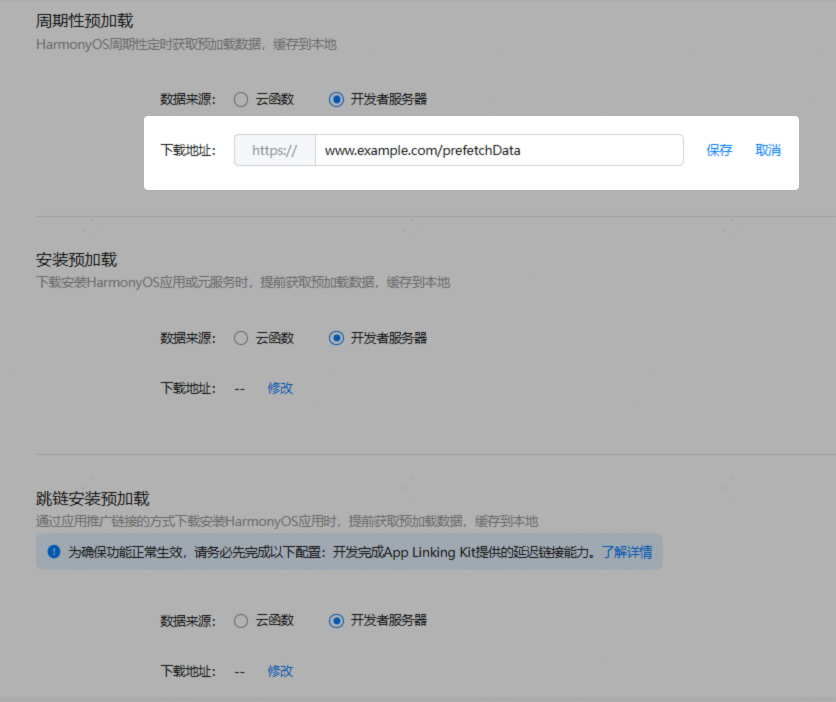 - 仅支持填写一个服务器地址,需包含预加载资源接口路径,如图中示例:prefetchData。