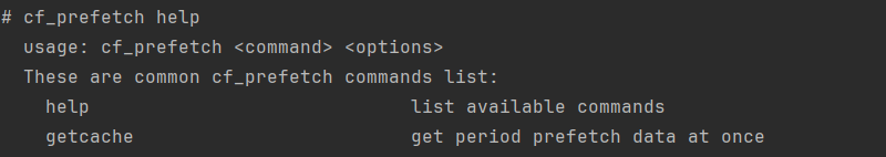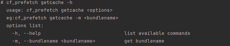 输入cf_prefetch getcache -h,获取getcache命令支持的参数信息。