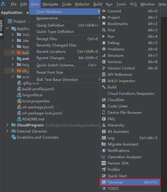 打开DevEco Studio,菜单栏选择“View > Tool Windows > Terminal”进入Terminal窗口。