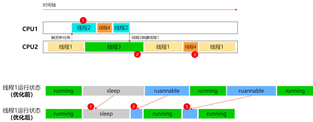 - 线程1被线程2唤醒后,等待的时间减少;