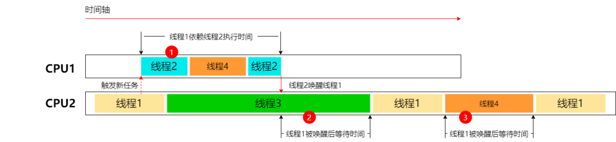 - 线程1优先级低,它被唤醒后等待运行时间长;