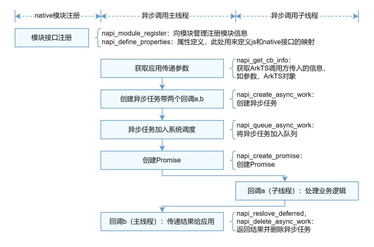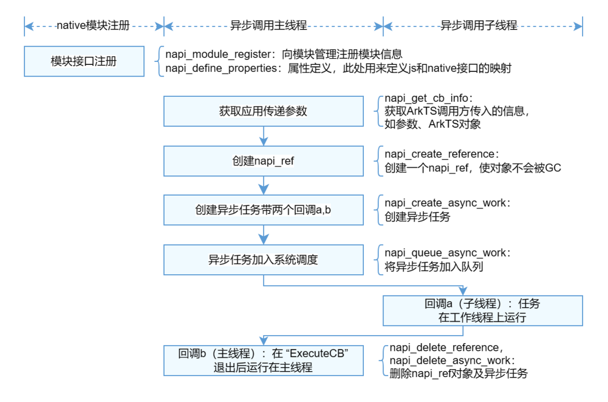 使用napi_create_async_work创建异步任务,使用napi_queue_async_work将任务加入队列,等待执行。