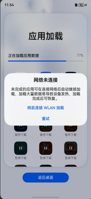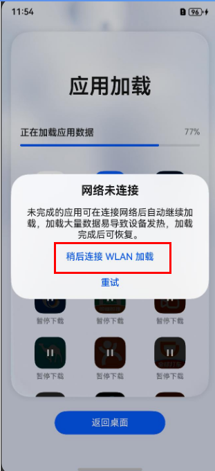 单击“稍后连接WLAN加载”按钮,进入桌面后连接网络,终端设备网络可用后,恢复应用数据迁移。