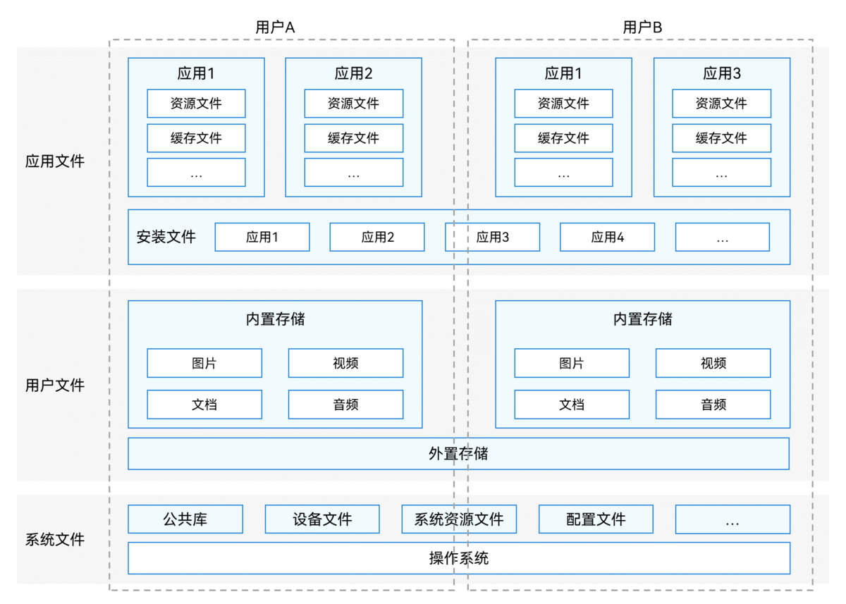- 应用文件:文件所有者为应用,包括应用安装文件、应用资源文件、应用缓存文件等。