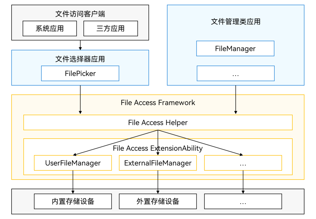 - File Access ExtensionAbility:提供文件访问框架能力,由内卡文件管理服务UserFileManager和外卡文件管理服务ExternalFileManager组成,实现对应的文件访问功能。