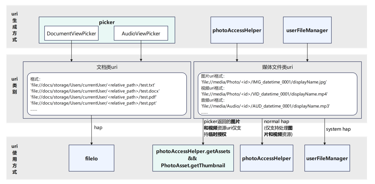 用户文件URI是文件的唯一标识,在对用户文件进行访问与修改等操作时往往都会使用到URI,不建议开发者解析URI中的片段用于业务代码开发,不同类型的URI使用方式将在下文详细介绍。