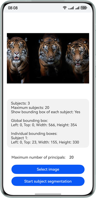 let data: subjectSegmentation.SegmentationResult = await subjectSegmentation.doSegmentation(visionInfo, config);let outputString = `Subject count: ${data.subjectCount}\n`;outputString += `Max subject count: ${config.maxCount}\n`;outputString += `Enable subject details: ${config.enableSubjectDetails ? 'Yes' : 'No'}\n\n`;let segBox : subjectSegmentation.Rectangle = data.fullSubject.subjectRectangle;let segBoxString = `Full subject box:\nLeft: ${segBox.left}, Top: ${segBox.top}, Width: ${segBox.width}, Height: ${segBox.height}\n\n`;outputString += segBoxString;if (config.enableSubjectDetails) {outputString += 'Individual subject boxes:\n';if (data.subjectDetails) {for (let i = 0; i < data.subjectDetails.length; i++) {let detailSegBox: subjectSegmentation.Rectangle = data.subjectDetails[i].subjectRectangle;outputString += `Subject ${i + 1}:\nLeft: ${detailSegBox.left}, Top: ${detailSegBox.top}, Width: ${detailSegBox.width}, Height: ${detailSegBox.height}\n\n`;}}}