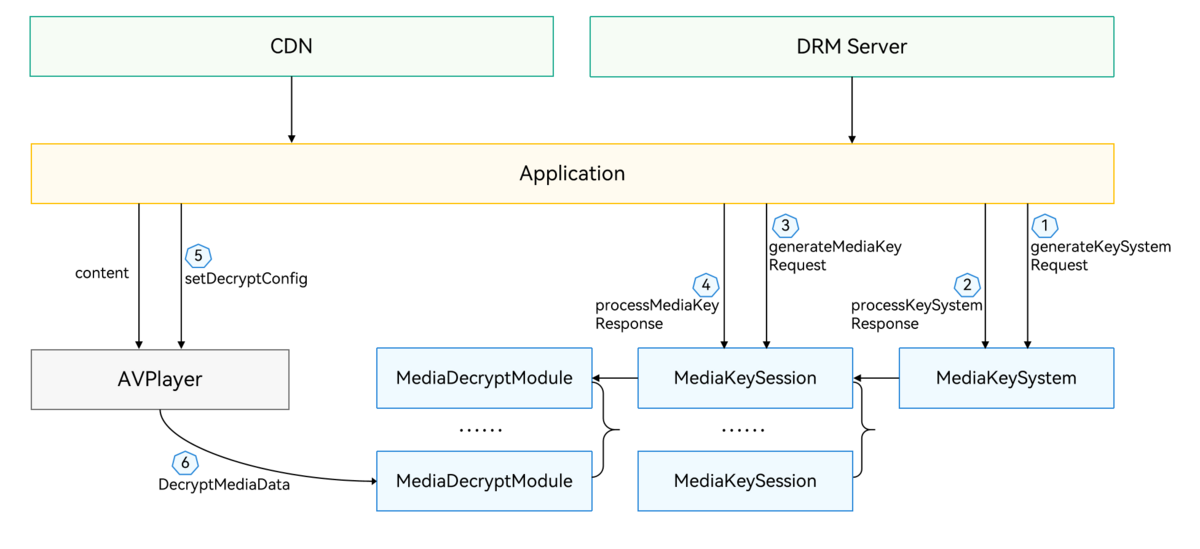 - 许可证获取:应用根据DRM事件中的pssh数据调用MediaKeySession的许可证相关接口完成DRM许可证的请求、处理。