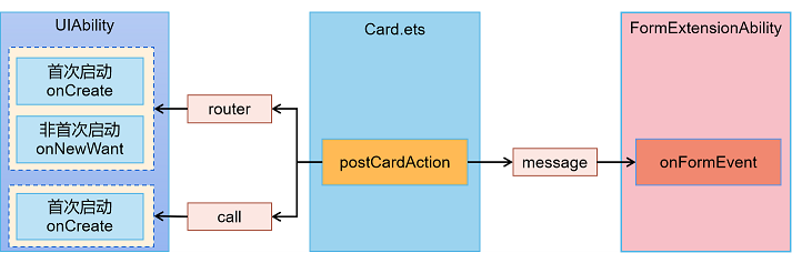 - message事件:可以使用message拉起FormExtensionAbility,通过onFormEvent接口回调通知,以完成卡片内控件点击消息传递,从而更新卡片内容。