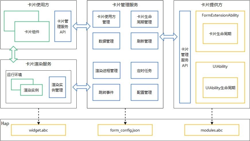 - 卡片管理服务:用于管理系统中所添加卡片的常驻代理服务,提供formProvider的接口能力,同时提供卡片对象的管理与使用以及卡片周期性刷新等能力。