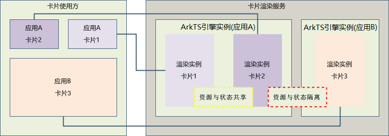 与JS卡片相比,ArkTS卡片支持在卡片中运行逻辑代码,为确保ArkTS卡片发生问题后不影响卡片使用方应用的使用,ArkTS卡片新增了卡片渲染服务用于运行卡片页面代码widget.abc,卡片渲染服务由卡片管理服务管理。卡片使用方的每个卡片组件都对应了卡片渲染服务里的一个渲染实例,同一卡片提供方的渲染实例运行在同一个ArkTS虚拟机运行环境中,不同卡片提供方的渲染实例运行在不同的ArkTS虚拟机运行环境中,通过ArkTS虚拟机运行环境隔离不同卡片提供方卡片之间的资源与状态。开发过程中需要注意的是globalThis对象的使用,相同卡片提供方的卡片globalThis对象是同一个,不同卡片提供方的卡片globalThis对象是不同的。