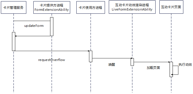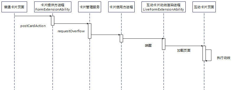 开发者可以通过formProvider.requestOverflow接口触发互动卡片动效,例如在用户点击时触发,典型时序图如下。