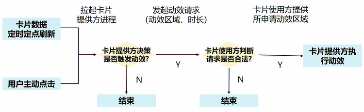 - 其他触发方式,例如通过卡片定时定点数据刷新机制触发动效,遵循先到先得原则。系统只处理第一个合法动效请求。其他请求返回失败,同时不做缓存。