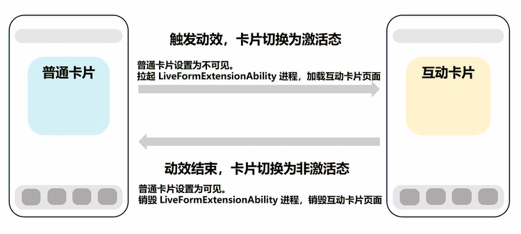 激活态: 表示互动卡片动效渲染状态,在此状态下,卡片UI由卡片提供方所开发的LiveFormExtensionAbility对应page页面完成渲染。详细可参考场景动效类型互动卡片开发指导。